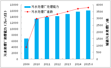 历年来我国污水处理设施建设及污水处理率变化情况见图9-图10。2015年,全国城市污水处理率达到91.97%,完成“十二五”规划目标要求。同时,根据住房和城乡建设部公布的2015年第二季度全国城镇污水处理设施建设运行情况,截至2015年6月底,全国设市城市、县(以下简称城镇,不含其它建制镇)累计建成污水处理厂3802座,污水处理能力达1.61亿立方米/日。全国设市城市建成运行污水处理厂共计2149座,形成污水处理能力1.32亿立方米/日。全国已有1427个县城建有污水处理厂,占县城总数的88.4%;累计建成污水处理厂1653座,形成污水处理能力0.29亿立方米/日。